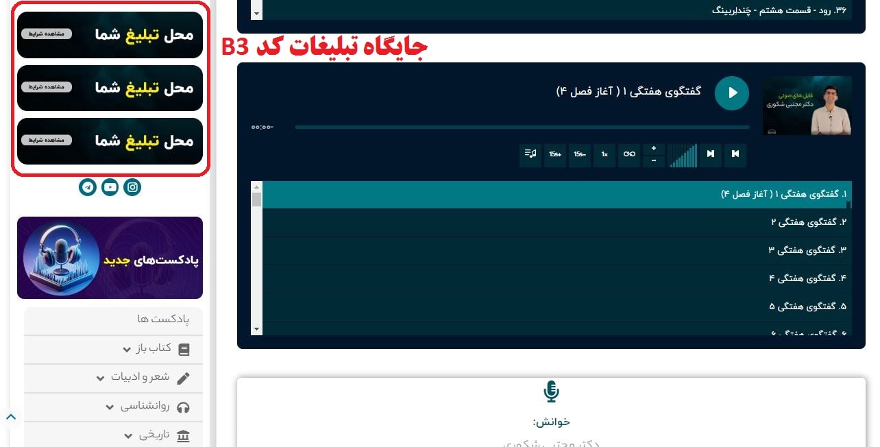 | B302 | تصویر 400×100 | 15 روز | تمام صفحات پادکست | ندارد | سایدبار دسکتاپ |